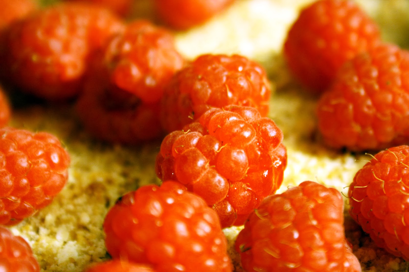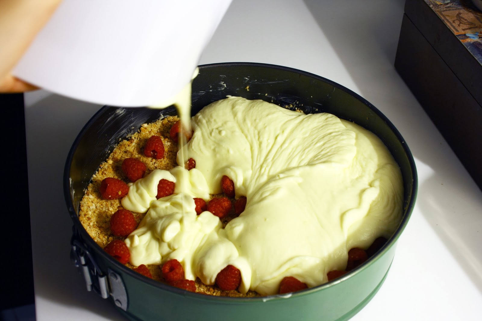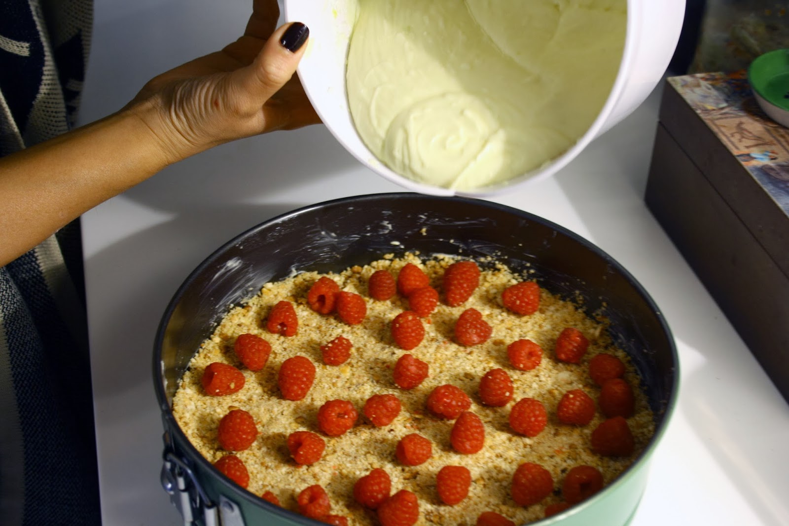 5) Take the cake’s base out of the fridge and spread all of the raspberries on top