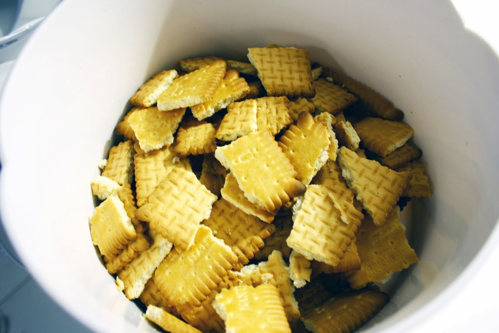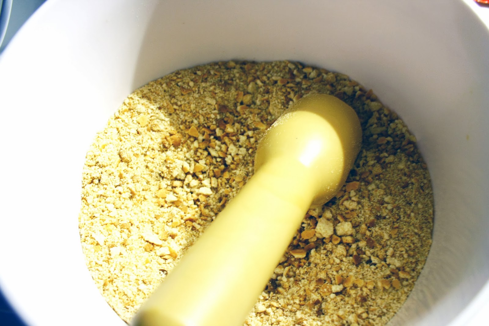 1) In a bowl, crush the biscuits. Then add the melted butter on top